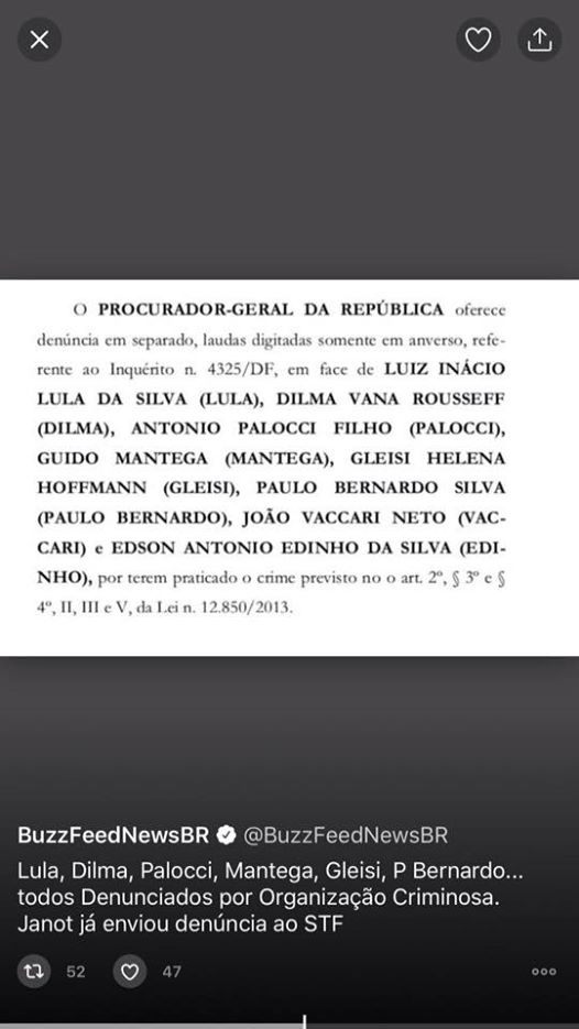 O procurador-geral da República, Rodrigo Janot, denunciou o ex-presidente Luiz Inácio Lula da Silva, a ex-presidente Dilma Rousseff afirmando que eles formaram uma organização criminosa quando foram presidentes da República com demais integrantes da cúpula dos governos petistas. Janot aponta Lula como “grande idealizador” da organização criminosa formada no âmbito da Lava Jato e pede pena agravada ao ex-presidente.
