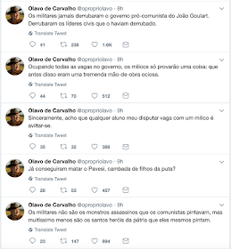 Ao lado, postagens de ontem de Olavo de Carvalho, xingando os militares brasileiros.