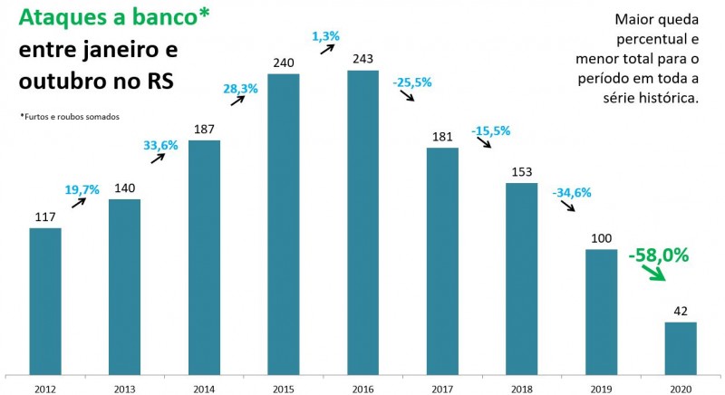 Os ataques a banco tiveram queda de 86,7%, de 15 casos no 10° mês de 2019 para apenas dois em todo o Estado no mesmo intervalo deste ano – um roubo em Porto Alegre, no dia 23, e um furto em São Leopoldo, no dia 24. O número é também o menor para outubro desde que começou a contabilização individual dos crimes contra estabelecimentos bancários, em 2012.